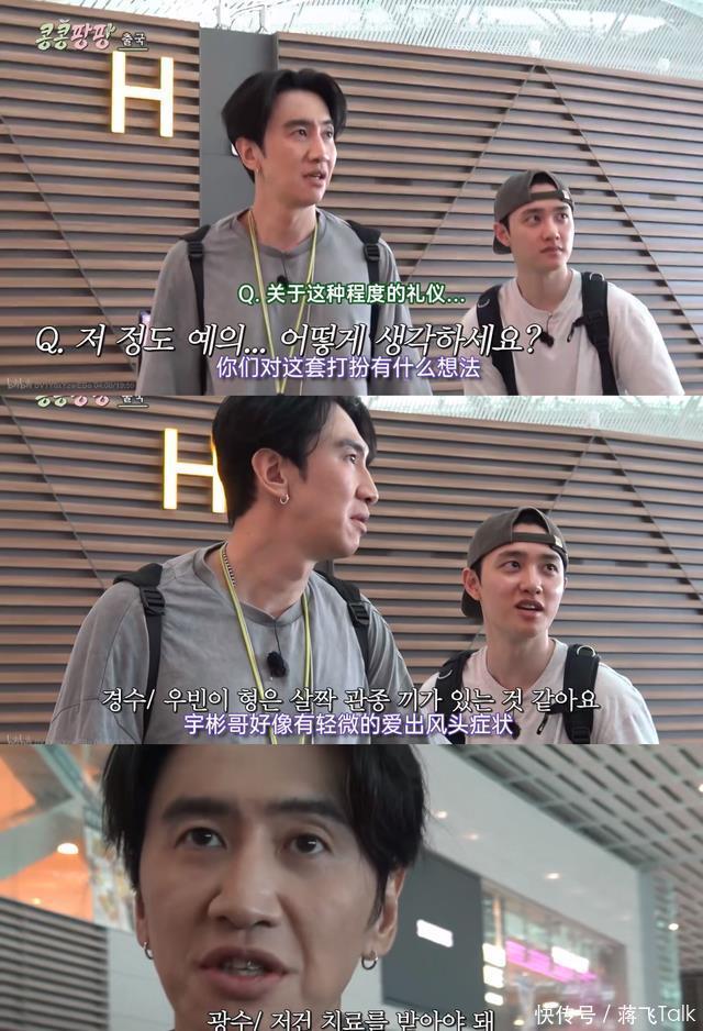 节目组的后采也很搞笑,让嘉宾当面或背后蛐蛐不在的人。 趁着宇彬去洗手间换衣服,后采让光洙和D.O.点评宇彬的这套装扮,结果两人都没有点评衣服, 直接“攻击人品” ,笑死。